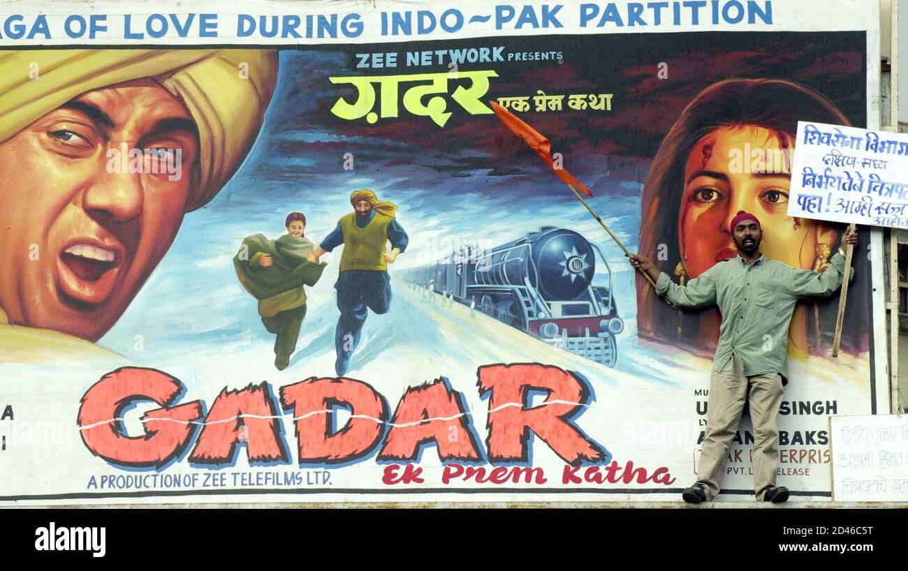 An Activist From The Militant Right Wing Hindu Shiv Sena Party Holds A Banner Exhorting People To See The Movie Gadar Ek Prem Katha Mutiny A Love Story As He Stands In Front Of A - Where is it shot > films.